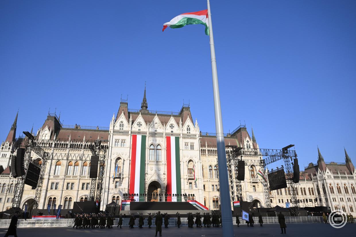 Március 15. – Az Országház előtt felvonták a nemzeti zászlót