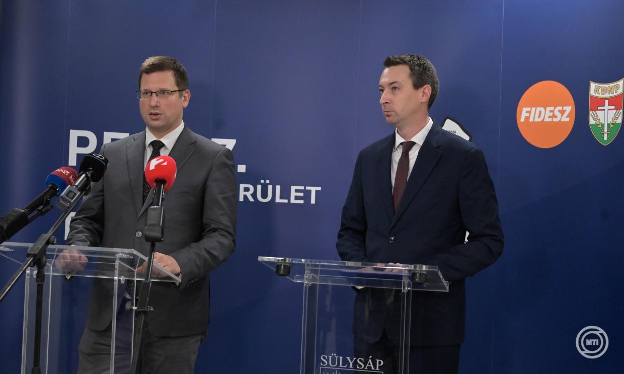 Gulyás Gergely és Katus Norbert, a Fidesz-KDNP országgyűlési képviselőjelöltje a sajtótájékoztatón a kormány országjárásának céljait és a jelenlegi helyzetet elemezték, kiemelve a béke melletti elkötelezettségüket.