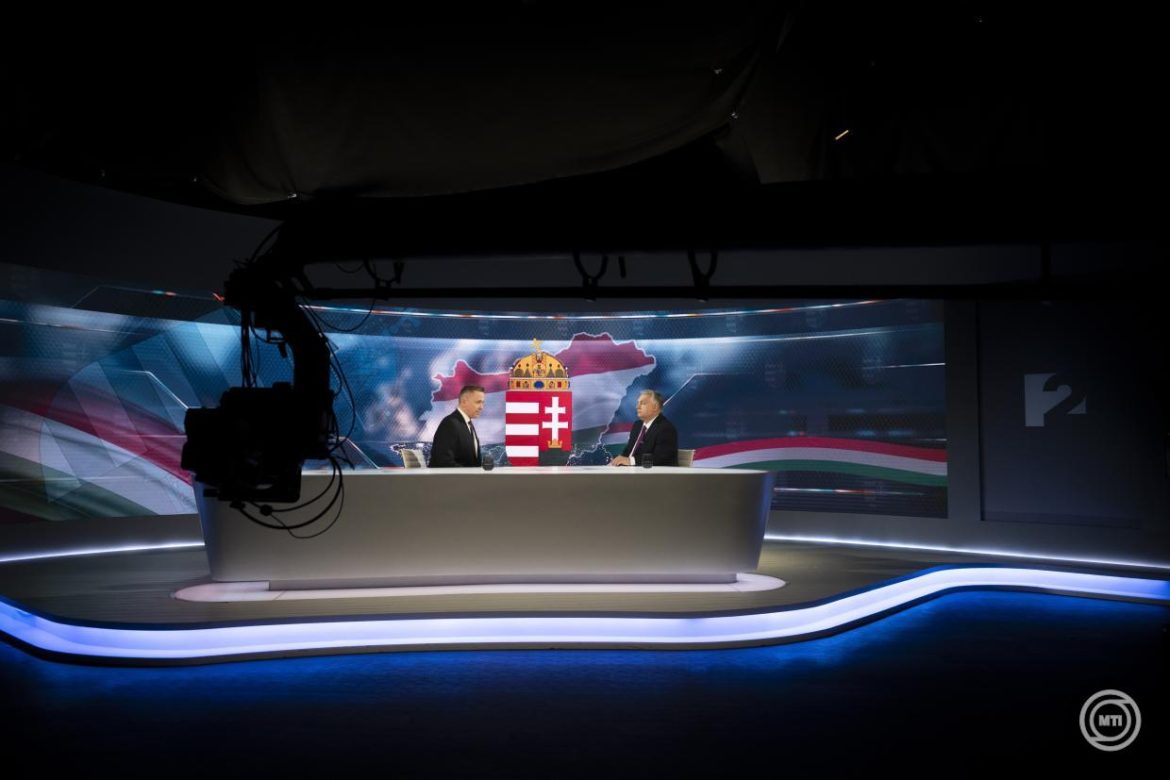 Forrásként a Miniszterelnöki Sajtóiroda által közreadott képet említjük, melyen Orbán Viktor a TV2 műsorában Donald Trump amerikai elnök és Volodimir Zelenszkij ukrán elnök találkozóját értékeli.